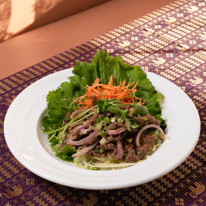 Grilled beef slice tossed with lime sauce e-san style, red-green onions, cilantro, mints, and ground rice