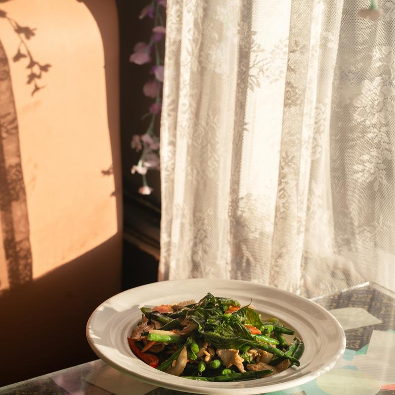 Stir-fry with onion, carrot, red & green bell pepper, fresh garlic, chilies, and basil leaves