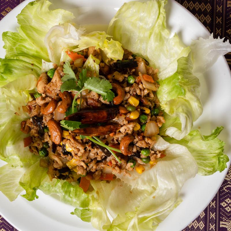 Ground chicken, onion, assorted mixed vegetables stir-fry in sweet chili house sauce, served with fresh lettuce wrap