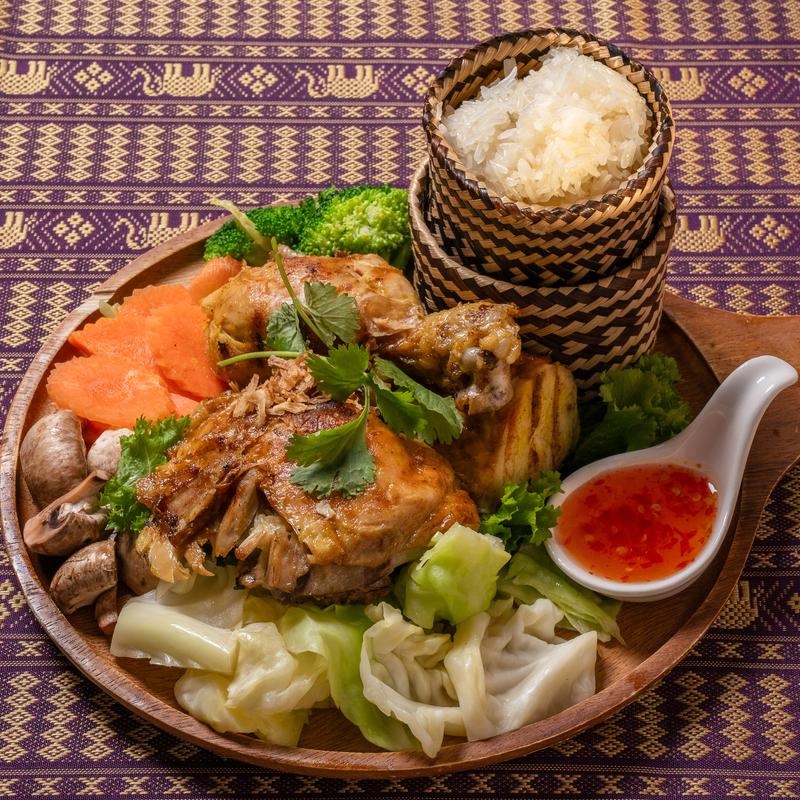 Grill chicken marinated in Thai herbs serve with sweet chili sauce and sticky rice