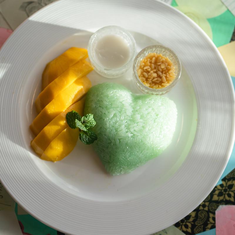 Steamed sticky rice doused in coconut milk served with sweet mango slices